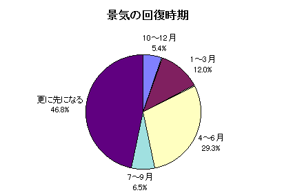 景気の回復時期について、半年以内に回復すると回答した企業は2割弱で、前回から8.0ポイント減少した。一方で、35.8%の企業が半年以降〜1年以内と回答しており、(1年後より)「さらに先になる」と回答している企業も前回より12.4ポイント増え、46.8%となった。前回までのゆるやかな回復傾向から、今回は景気の回復感が再び停滞気味となった。