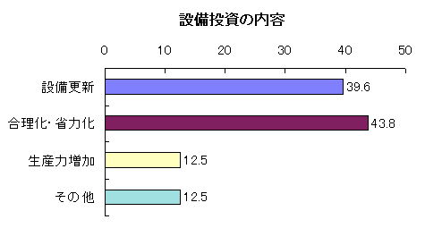 月度調査以来最も多かった「設備更新」に代わり「合理化・省力化」が最も多くなっており、「生産力増加」のための設備投資は依然として低調である。