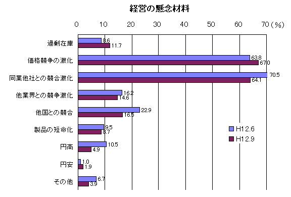経営の懸念材料としては「同業他社との競合」「価格競争の激化」が前回同様他を大きく引き離している。また「過剰在庫」も前回に比べ、若干増加している。