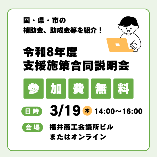 2026/3/19(木) 14:00~16:00 主に中小・小規模企業の方が活用できる令和8年度の支援施策(補助金・助成金)等について、近畿経済産業局・福井労働局・福井県・福井市の担当者による説明会を開催します。 支援制度を上手く活用して設備投資や販路開拓に取り組み、生産性向上・賃上げを進めましょう!