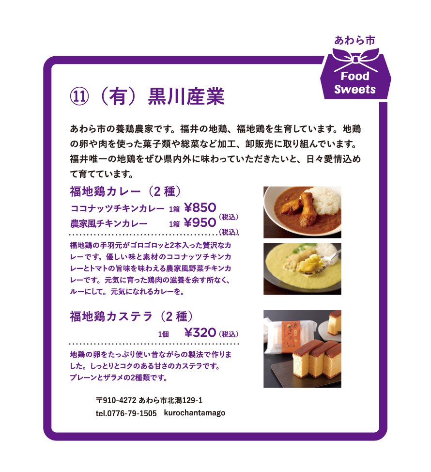 福地鶏カレー(2種) 福地鶏カステラ(2種) |